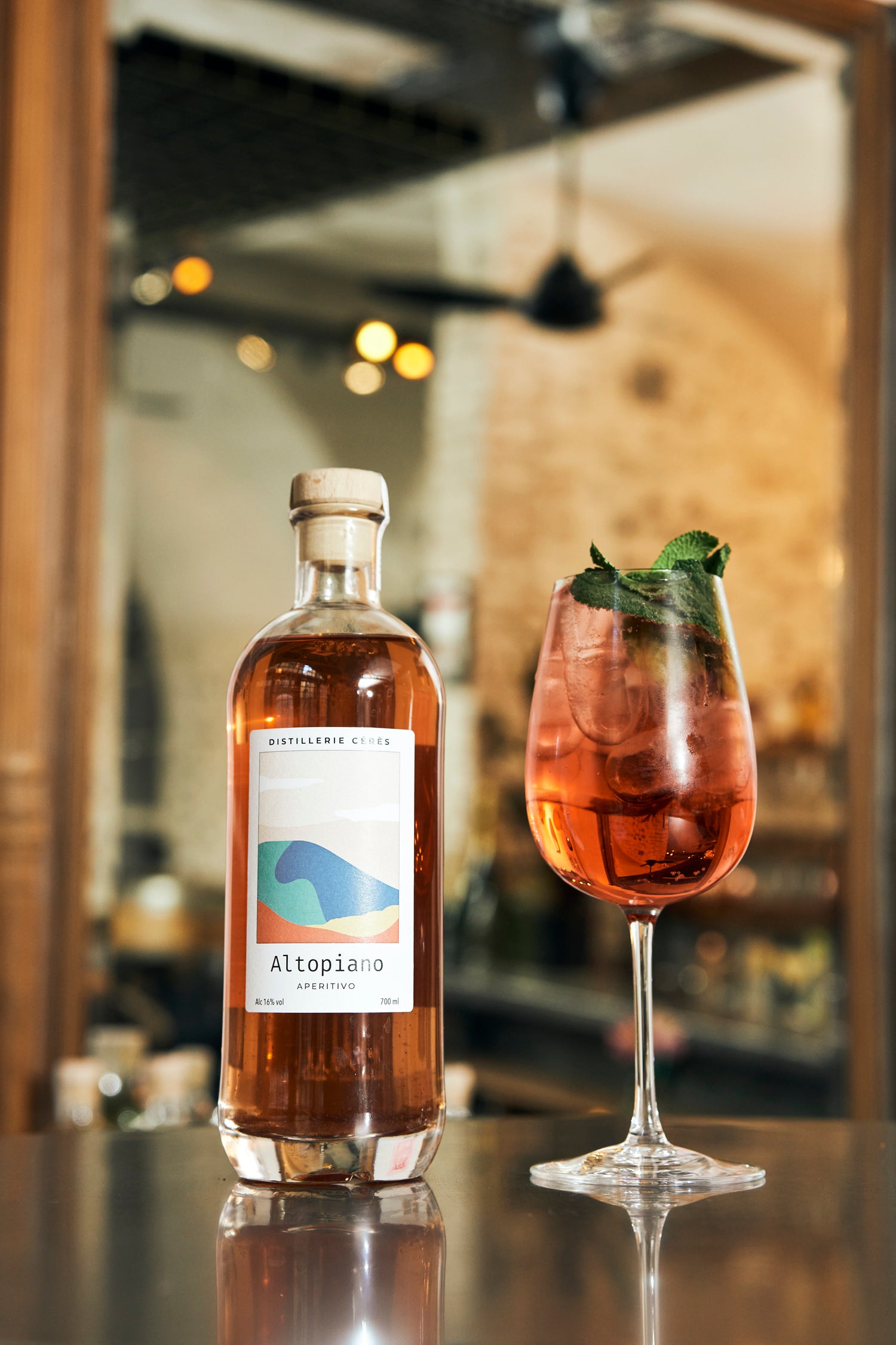 To produce Altopiano, we macerate rhubarb, raspberry, redcurrant, and gentian root in wine alcohol for several weeks. After filtering the macerate, the fruits are distilled with aromatic plants: tarragon, verbena, basil, thyme, and rosemary. This fruit-plant distillate is then blended with the macerate. The whole is then sweetened and bottled at 16% ABV.