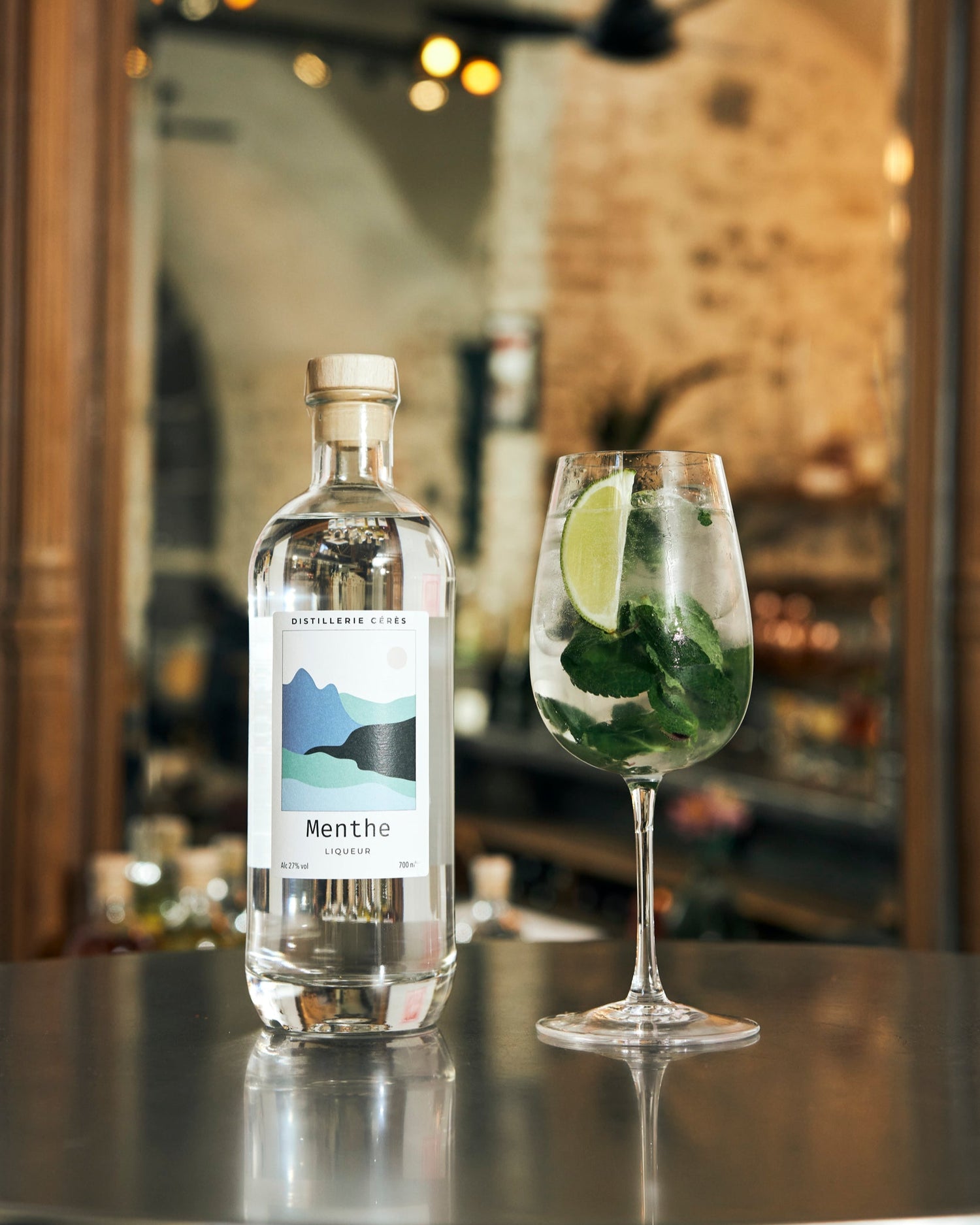 To prepare our mint liqueur, we distill fresh peppermint leaves in neutral wine alcohol. We then obtain a mint distillate that we sweeten and bottle at 27% ABV.